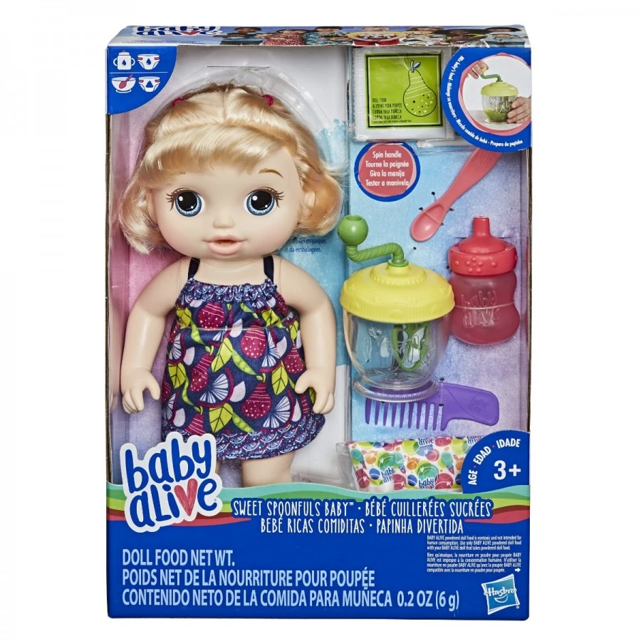 Sweet Spoonfuls Baby Alive is for kids to pretend to play with the baby by feeding the baby pretend food and even changing the doll’s diapers when the baby poops or pees. The doll wears a removable outfit for easy cleaning and comes with a comb for kids to comb her hair. In the box, you will also find a blender, 2 packets of powder food along with a feeding spoon, a feeding bottle, and 2 diapers. Kids can pour the powder food along with water in the blender and use the handle to mix it manually. Use the spoon to feed the baby and the bottle to give water to the baby. In no time, the baby will be pooing and peeing, so make sure the diaper is checked once you have fed the baby. They are designed for children above 3 years of age. Sweet Spoonfuls Baby Alive is made of plastic and does not need any batteries. The doll’s parts move easily, but they are not designed to come off.
