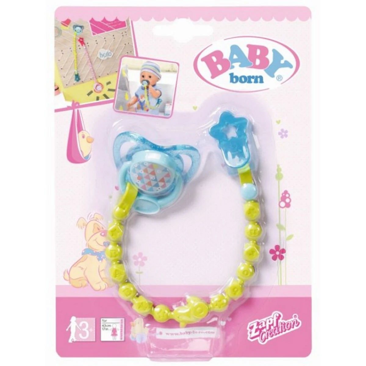 Dummies, which are also referred to as pacifiers or soothers, are small items that can easily be misplaced or hard to find. These dummies are widely used by parents to help soothe their babies and to encourage them to sleep or stop them from crying. If your baby is used to their dummy to sleep, they will become restless and cry if they are not given their dummy. This Baby Born Dummies & Chain is the perfect product to ensure your baby’s dummy is always on hand and is never misplaced or lost when your baby needs the dummy. This dummy set has a chain attached to the dummy, and this set can be securely clipped to the baby’s clothing. The design of this Baby Born Dummies & Chain looks as if it is composed of tiny building blocks with a BABY born stamped on it and glows in the dark. Suitable for newborns until age 3.