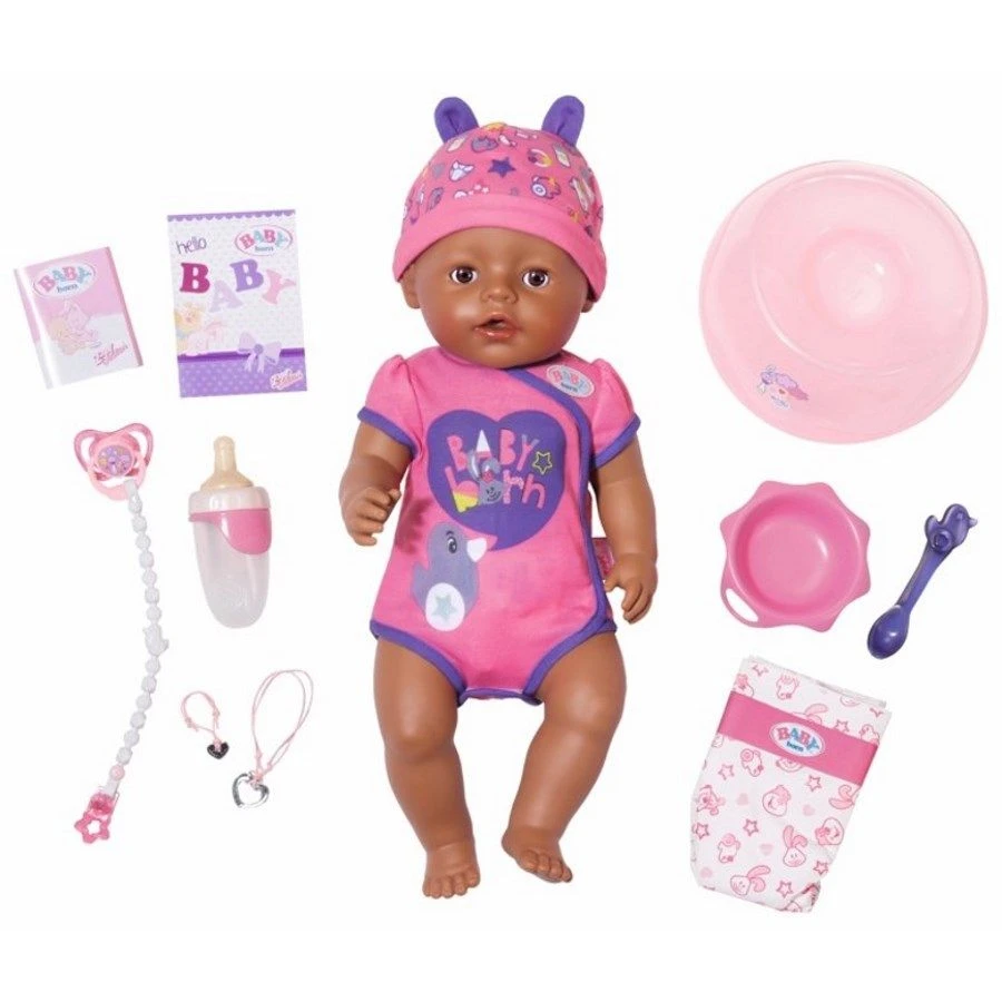 This Baby Born Doll is a perfect interactive doll for your little ones to play with and love. The Baby Born ethnic girl doll has brown eyes and soft-touch flexible limbs. It comes with nine lifelike functions and eleven accessories. The ethnic doll from Baby Born can cry, drink from her bottle, take a real bath, eat porridge, sleep, wet the nappy, use the potty, and is more flexible for effortless dressing and undressing. The accessories include a birth certificate, bodysuit, hat, plate, spoon, bottle, a portion of porridge, potty, nappy, a dummy with dummy chain, and a friendship bracelet for the kid and the doll. Playing with this interactive doll promotes imagination and social development skills in kids. It also promotes values such as responsibility, empathy, and communication. The doll is 43 cm in size. Baby Born Interactive Doll Ethnic Soft Touch is recommended for kids aged three and above.