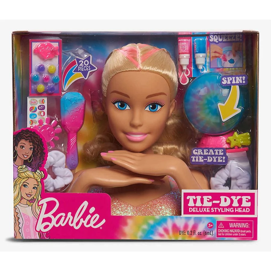 Barbie’s signature appearance now incorporates tie-dye fashion! Her pink streaked, thick, flowing blonde hair is perfect for braiding and brushing into chic styles. Little stylists may create unique tie-dye looks by spinning the supplied scrunchies and ribbon in the spinner! Spin the spinner after adding the scrunchie or ribbon and dye colours; the sphere’s rotation on the base will assist the dye spread out on the pieces. Have fun adorning Barbie’s nails with the tie-dye nail stickers and the customised barrettes with plug-in diamonds. Kids will especially love putting the scrunchie and ribbons in their own hair to show off their fashion style to their peers. Barbie will be the most fashionable girl in town! One Barbie Deluxe Tie-Dye Styling Head, one manual tie-dye spinner, two scrunchies, a ribbon, a multicolour brush, two interchangeable barrettes, eight plug-in jewels, one nail wheel, and nail stickers are all included in the full set. Ages 3+.