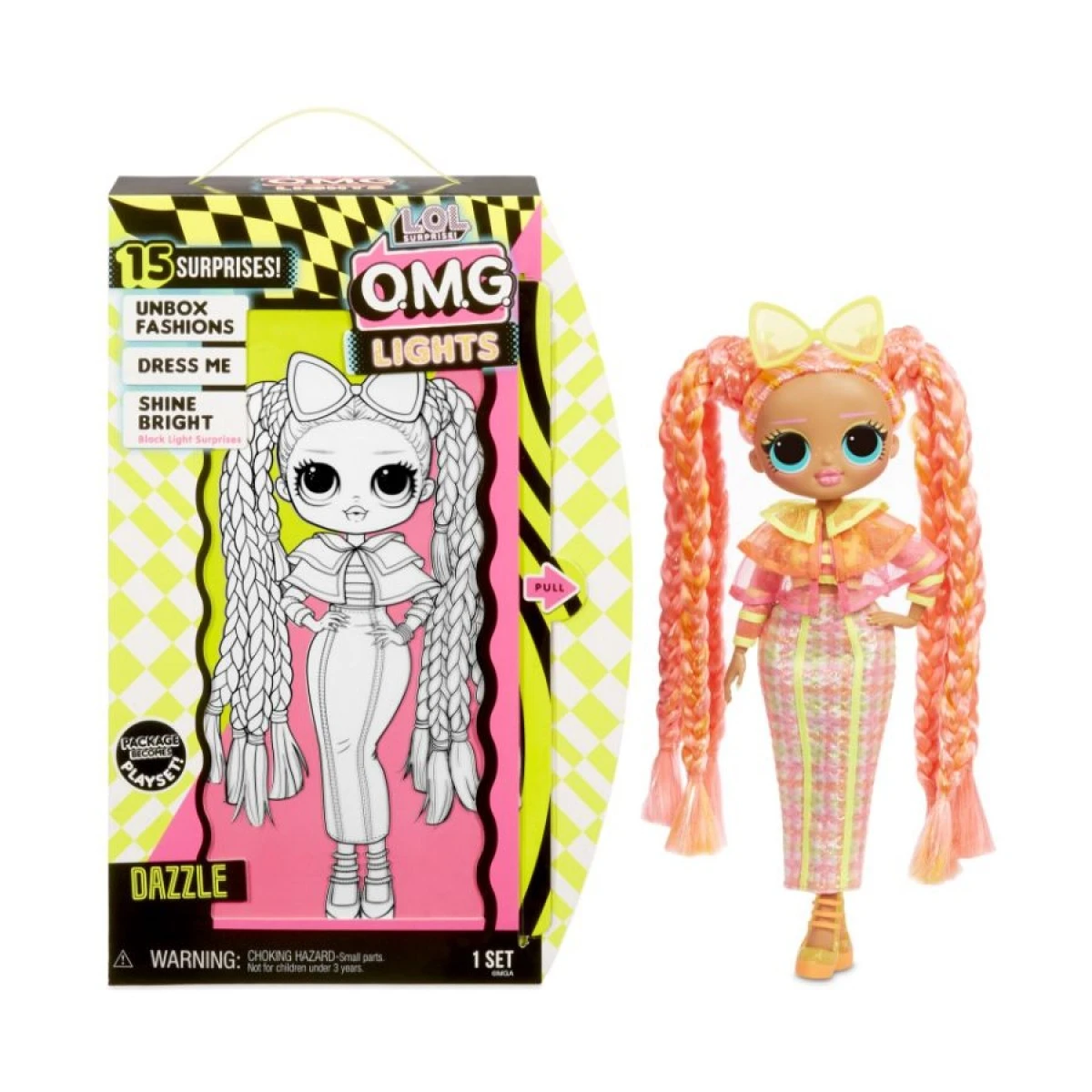 The stunning OMG Lights Series fashion dolls have gorgeous features and beautiful hair. Every doll is special and has its own fabulous style. The dolls come with fabric garment bags, reusable dressing room play space, washable saran hair, doll stand, and many more fashionable things. The black light included in the box reveals some interesting neon surprises. The Groovy Babe in black and white love the coffee shop as she loves to sit and write poetry there. Her trendy boots are to die for, and her gorgeous silver hair is nothing less than Rapunzel. The Drag Racer wears a unique and trendy racing outfit and pairs them with exquisite white boots. Her blonde hair is rolled neatly, and a pretty peach bow holds her ponytail in place. Glitter Queen looks dazzling in her glamourous outfit. Her long hair is braided neatly with a decorative yellow bow in the centre. The colour of her hair matches her outfit, and her neon and golden sandals complete her look. The fashion dolls offer hours of play for children. They can play with just a single doll or play with the entire collection. The OMG Light Series Dolls are recommended for children 4 years and above.