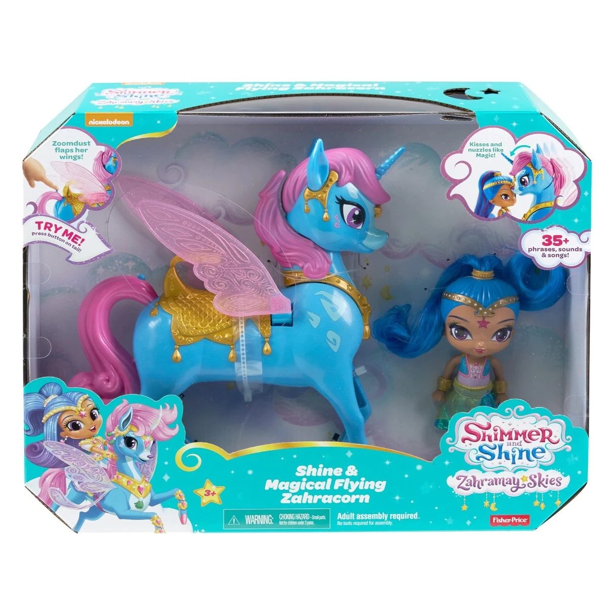 These are prominent assorted figures inspired by special episodes of Shimmer and Shine, where genies ride on their flying Zahracorns up into the magical world of Zahramay Skies. When your little one opens this pretty genie bottle, they will find a surprise genie inside the magic bottle. This magic bottle features a handy clip for the kids to take their genies wherever they go. The pack includes Teenie Genis figure Shimmer and her Zahrcorn Zahora. The Zharcorn features sparkly, springy wings that flutter and bounce when moved. These assorted figures are a part of the Shimmer and Shine, Zahracorn Play Park, with many fun features. There are over 30 genies to collect in fun themes, and each of them is sold separately. The recommended age group for this toy is above three years. Size of this product out of the box is 7cm x 14cm x 6cm.